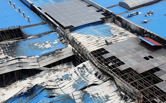 為什們會這么快就坍塌呢?我們做個簡單分析:事發(fā)現(xiàn)場滿目瘡痍,猶如世界末日,從現(xiàn)場我們可以看出,該建筑是由鋼結(jié)構(gòu)為主體加上彩鋼夾芯板作為圍護(hù)建成的一座鋼結(jié)構(gòu)商城,是一個典型的鋼結(jié)構(gòu)建筑。鋼結(jié)構(gòu)做為一種綠色建筑的代表,不耐火是它的劣勢,也是致命傷,從此次事故現(xiàn)場我們能看到,由于鋼結(jié)構(gòu)柱子受熱已經(jīng)變形扭曲剛度逐漸下降,慢慢失去了承重的能力,因而造成了商場建筑的坍塌。我們還可以看到該建筑的屋頂采用的是巖棉夾芯板,而巖棉的防火性能比較好,基本不燃,所以,主要的火源是商場的貨物。大火炙烤著底部的鋼結(jié)構(gòu)柱子,當(dāng)溫度越高,鋼構(gòu)件的強(qiáng)度就越弱,以至于承受不起屋頂?shù)闹貕憾斐闪丝逅?/p>